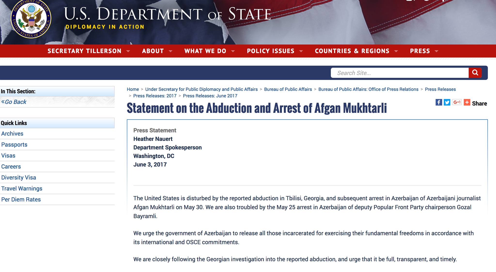 “ABŞ sonradan Azərbaycanda həbs olunması ilə nəticələnən azərbaycanlı jurnalist Əfqan Muxtarlının mayın 30-u Gürcüstanın paytaxtı Tbilisidə oğurlanması barədə məlumatdan narahatdır. Biz mayın 25-i AXCP sədr müavini Gözəl Bayramlının həbs olunmasından da narahatıq”, – bəyanatda bildirilir.