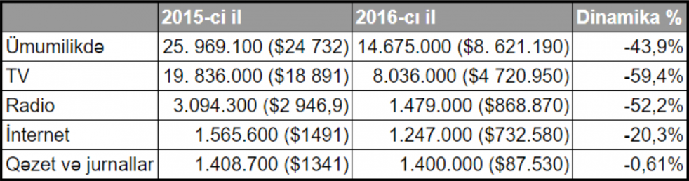 Dövlət Statisika Komitəsinin hesabatına görə, 2016-cı ildə Azərbaycan KİV-in iqtisadi tənəzzülü davam edib. Ümumilikdə KİV-in əsas leqal gəlirinin həcmi - mediareklam 43,9% azalaraq, 14.675.000 manat (8.621.190 dollar) təşkil edib.