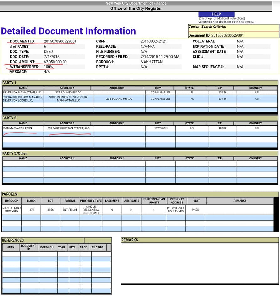 Çıxarışlardan da göründüyü kimi mənzillər fərqli əmlak şirkətləri vasitəsilə əldə olunub. Yəni ümumilikdə 4 milyon 250 min dollar. Mənzillərdən biri ilə bağlı Nyu York şəhər Maliyyə Departamentinə aid əlavə sənəddə (ID 2015070B00529001) mənzilin dəyərinin tam ödənildiyi əksini tapıb.